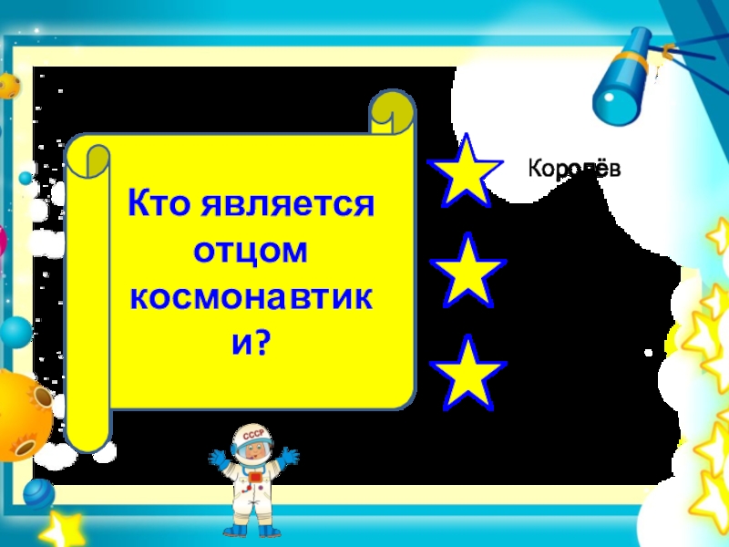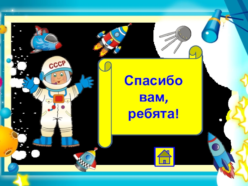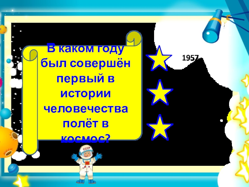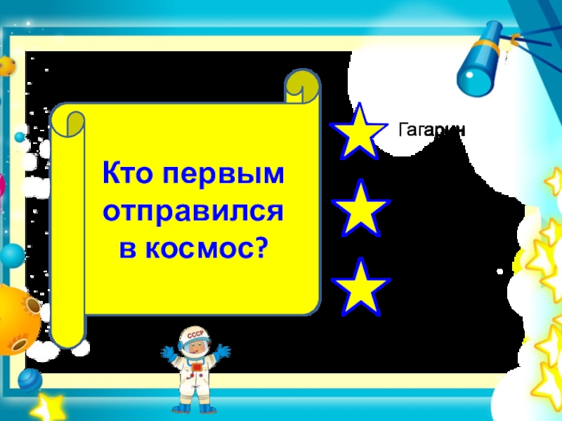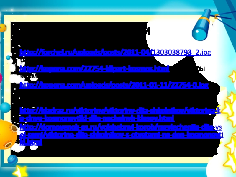 Источникиhttp://forchel.ru/uploads/posts/2011-04/1303038793_2.jpg  рамка http://kopona.com/22754-klipart-kosmos.html клипарты космосhttp://kopona.com/uploads/posts/2011-01-11/22754-0.jpg При составлении вопросов викторины использованы сайтыhttp://kladraz.ru/viktoriny/viktoriny-dlja-shkolnikov/viktorina-ko-dnyu-kosmonavtiki-dlja-nachalnyh-klasov.htmlhttp://domovenok-as.ru/volshebnyi-korob/razvlechenija-dlja-vsei-semi/viktorina-dlja-shkolnikov-s-otvetami-na-den-kosmonavtiki.html