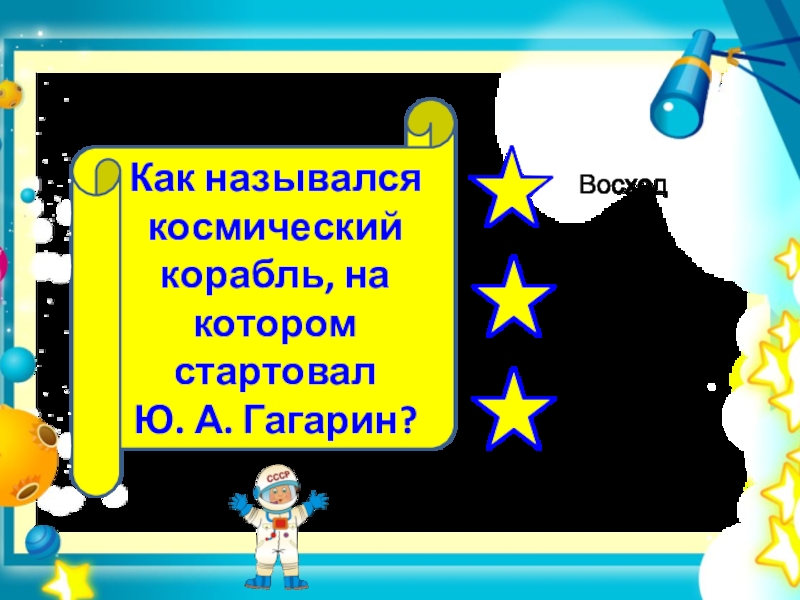 Слайд 6Как назывался космический корабль, на котором стартовал