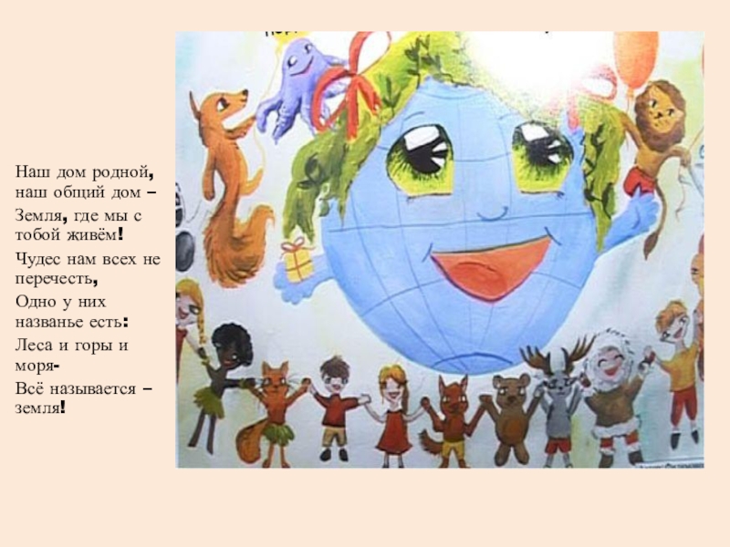 Наш дом родной, наш общий дом –Земля, где мы с тобой живём!Чудес нам всех не перечесть, Одно у них названье есть:Леса и горы и моря- Всё называется – земля!