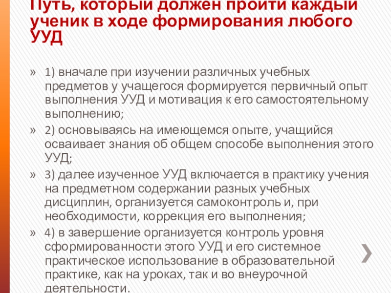 Слайд 11Путь, который должен пройти каждый ученик в ходе формирования любого УУД