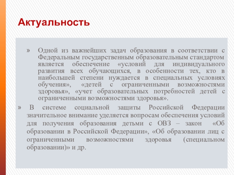 В системе социальной защиты Российской Федерации значительное внимание уделяется вопросам обеспечения условий для получения образования детьми с ОВЗ – закон «Об образовании в Российской Федерации», «Об образовании лиц с ограниченными возможностями здоровья (специальном образовании)» и др.