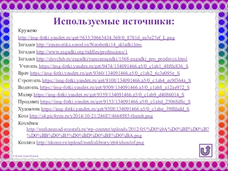 Используемые источники:Кружево http://img-fotki.yandex.ru/get/5633/39663434.369/0_8781d_ea3e27ef_L.pngЗагадки http://zanimatika.narod.ru/Narabotki14_skladki.htmЗагадки http://www.zagadki.org/riddles/professions/1Загадки http://slavclub.ru/zagadki/razniezagadki/1568-zagadki_pro_prodavca.html Учитель https://img-fotki.yandex.ru/get/9474/134091466.a5/0_c1ab1_48f0c836_SВрач https://img-fotki.yandex.ru/get/9360/134091466.a5/0_c1ab2_6c3e095e_SСтроитель https://img-fotki.yandex.ru/get/9108/134091466.a5/0_c1ab4_ec9f364a_SВодитель https://img-fotki.yandex.ru/get/9509/134091466.a5/0_c1ab8_a12ae972_SМаляр https://img-fotki.yandex.ru/get/9359/134091466.a5/0_c1ab9_d4086014_SПродавец https://img-fotki.yandex.ru/get/9153/134091466.a5/0_c1abd_25068d8c_SХудожник https://img-fotki.yandex.ru/get/9308/134091466.a5/0_c1abe_39ffdadd_SКоза http://s4.pic4you.ru/y2014/10-21/24687/4664985-thumb.pngКозлёнок http://muhammad-mustafa.ru/wp-content/uploads/2012/05/%D0%9A%D0%BE%D0%B7%D0%BB%D0%B5%D0%BD%D0%BE%D0%BA.png Козлята http://ukomr.ru/upload/medialibrary/eb4/nhonlof.png