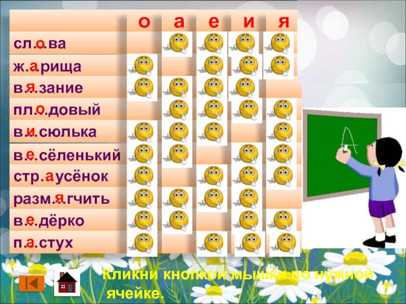 Кликни кнопкой мышки по нужной  ячейке.сл…важ…рищав…заниепл…довыйв…сюлькав…сёленькийстр…усёнокразм…гчитьв…дёркоп…стухоаеияоаяоиеаяеа