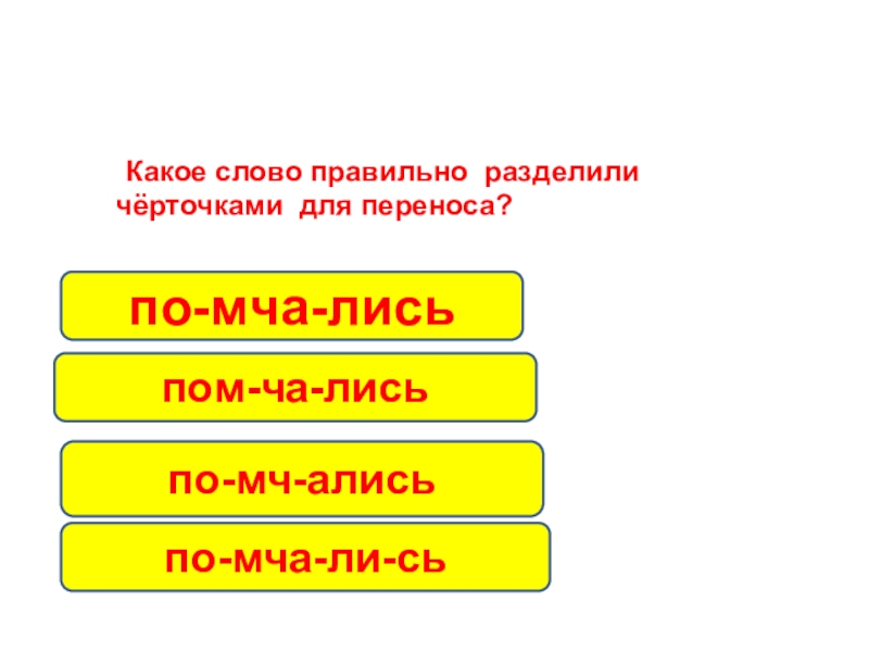 Какое слово правильно разделили чёрточками для переноса? по-мча-лисьпо-мч-алисьпом-ча-лисьпо-мча-ли-сь