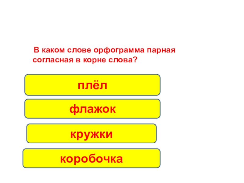 В каком слове орфограмма парная согласная в корне слова?кружкиплёлфлажоккоробочка