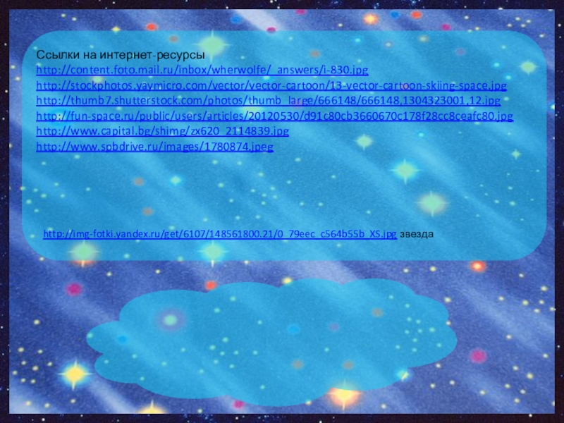 Ссылки на интернет-ресурсыhttp://content.foto.mail.ru/inbox/wherwolfe/_answers/i-830.jpg http://stockphotos.yaymicro.com/vector/vector-cartoon/13-vector-cartoon-skiing-space.jpg http://thumb7.shutterstock.com/photos/thumb_large/666148/666148,1304323001,12.jpg http://fun-space.ru/public/users/articles/20120530/d91c80cb3660670c178f28cc8ceafc80.jpg http://www.capital.bg/shimg/zx620_2114839.jpg http://www.spbdrive.ru/images/1780874.jpeg http://img-fotki.yandex.ru/get/6107/148561800.21/0_79eec_c564b55b_XS.jpg звезда