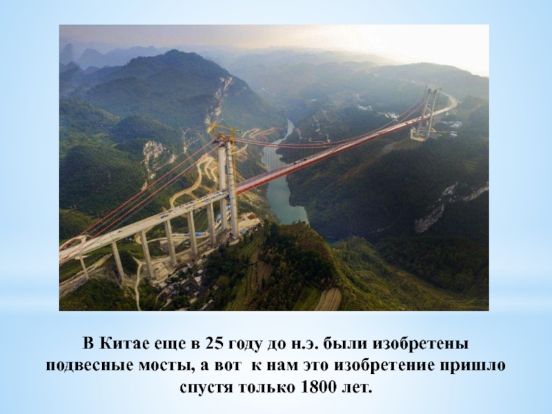 В Китае еще в 25 году до н.э. были изобретены подвесные мосты, а вот  к нам это