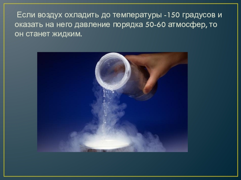 Слайд 7 Если воздух охладить до температуры -150 градусов и оказать на него