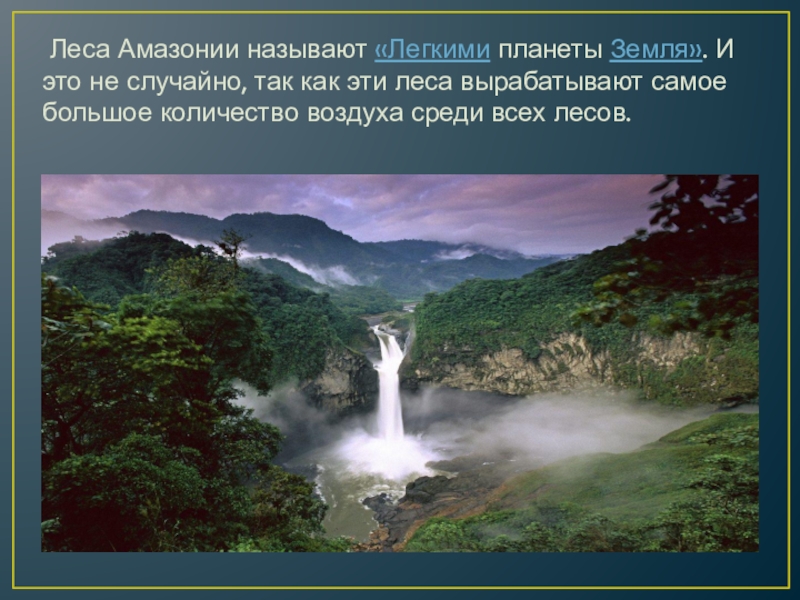Слайд 5 Леса Амазонии называют «Легкими планеты Земля». И это не случайно, так как эти леса