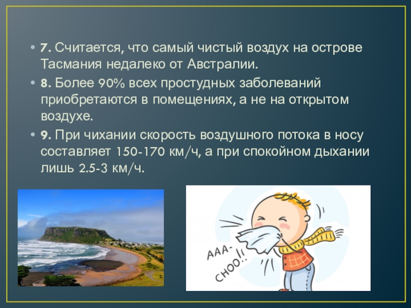 7. Считается, что самый чистый воздух на острове Тасмания недалеко от Австралии.8. Более 90% всех простудных заболеваний приобретаются в