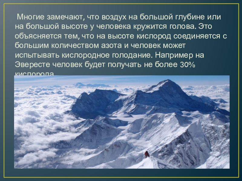 Слайд 4 Многие замечают, что воздух на большой глубине или на большой высоте
