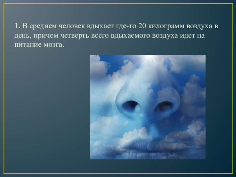 1. В среднем человек вдыхает где-то 20 килограмм воздуха в день, причем четверть всего вдыхаемого воздуха идет на
