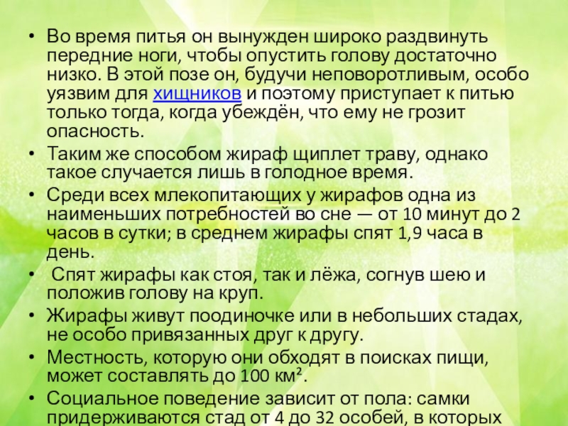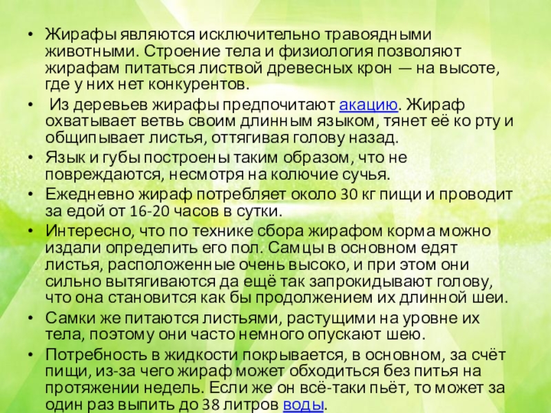 Слайд 10Жирафы являются исключительно травоядными животными. Строение тела и физиология позволяют жирафам