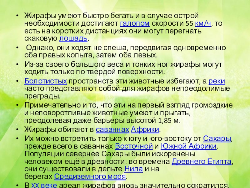 Слайд 8Жирафы умеют быстро бегать и в случае острой необходимости достигают галопом скорости 55 км/ч,