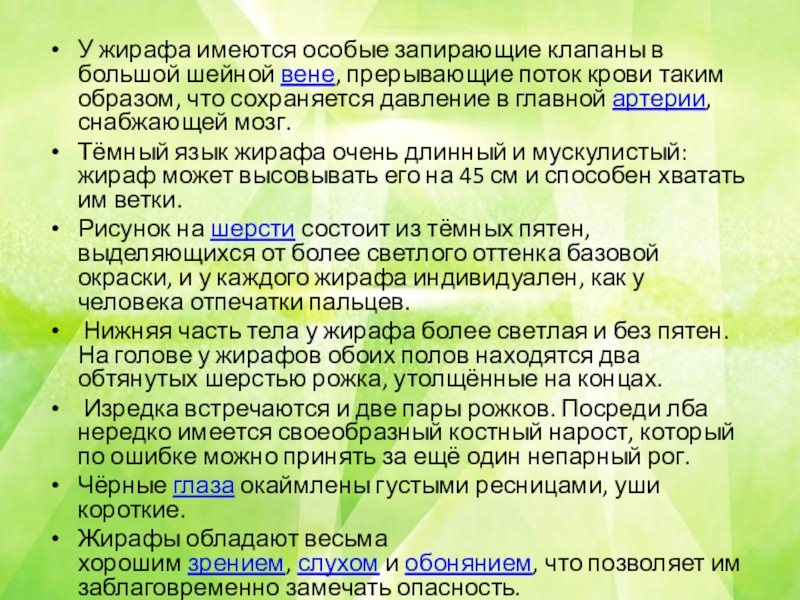 Слайд 6У жирафа имеются особые запирающие клапаны в большой шейной вене, прерывающие поток
