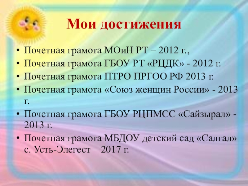 Мои достиженияПочетная грамота МОиН РТ – 2012 г.,Почетная грамота ГБОУ РТ «РЦДК» - 2012 г.Почетная грамота ПТРО