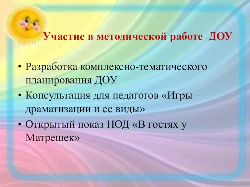 Участие в методической работе ДОУРазработка комплексно-тематического планирования ДОУКонсультация для педагогов «Игры –драматизации и ее виды»Открытый показ НОД