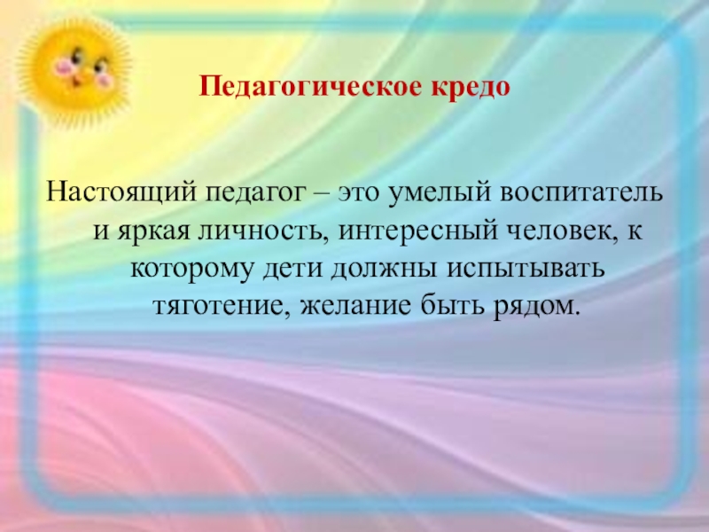 Педагогическое кредоНастоящий педагог – это умелый воспитатель и яркая личность, интересный человек, к которому дети должны