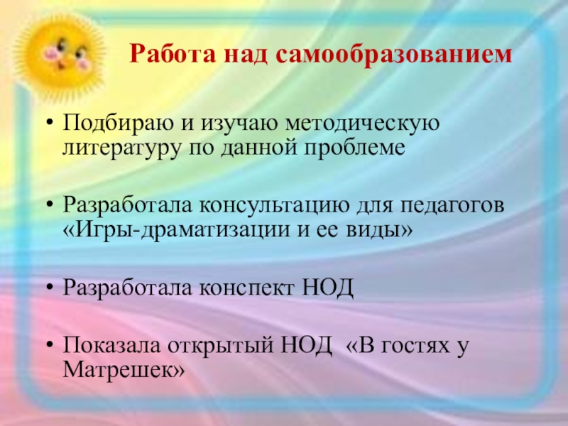 Работа над самообразованием Подбираю и изучаю методическую литературу по данной проблемеРазработала консультацию для педагогов «Игры-драматизации и ее