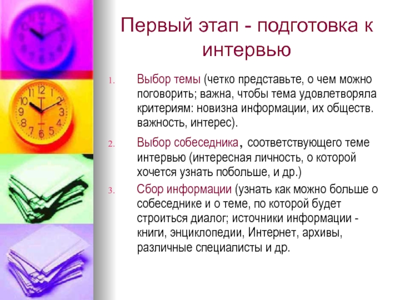 Работа над интервью делится на три этапа: подготовка, беседа, написа-ние материала.