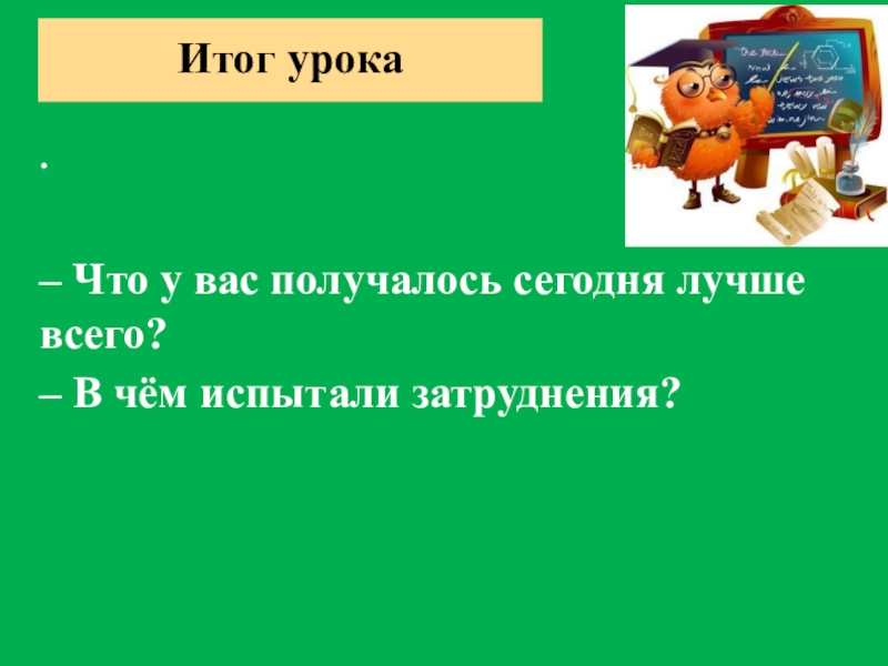 Итог урока– Что у вас получалось сегодня лучше всего? .– В чём испытали затруднения?
