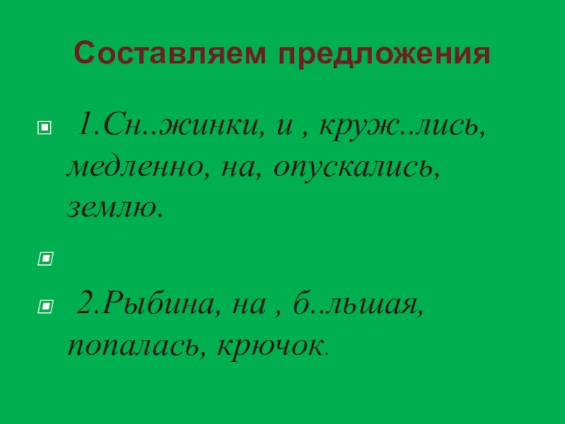 Составляем предложения 1.Сн..жинки, и , круж..лись, медленно, на, опускались, землю.  2.Рыбина, на , б..льшая, попалась, крючок.