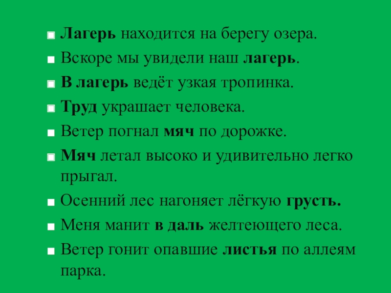 Лагерь находится на берегу озера.Вскоре мы увидели наш лагерь.В лагерь ведёт узкая тропинка.Труд украшает человека.Ветер погнал мяч по дорожке.Мяч летал высоко и удивительно легко