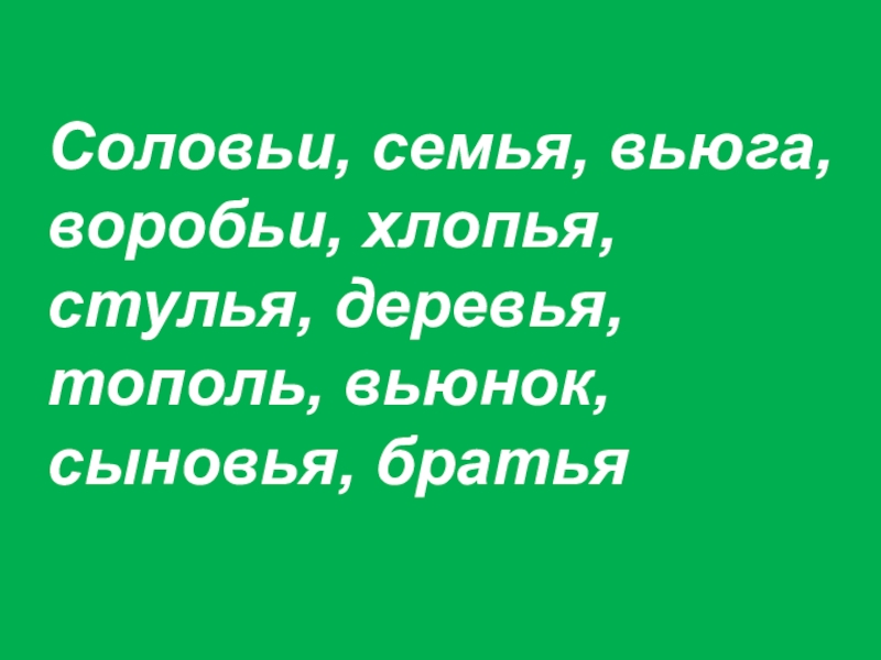 Слайд 4Соловьи, семья, вьюга, воробьи, хлопья, стулья, деревья, тополь, вьюнок, сыновья, братья