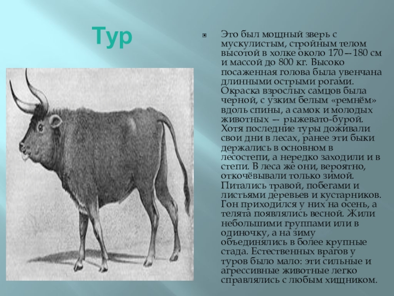 около 170—180 см и массой до 800 кг. Высоко посаженная голова была увенчана длинными острыми рогами. Окраска взрослых самцов была черной, с узким белым «ремнём» вдоль спины, а самок и молодых животных — рыжевато-бурой. Хотя последние туры доживали свои дни в лесах, ранее эти быки держались в основном в лесостепи, а нередко заходили и в степи. В леса же они, вероятно, откочёвывали только зимой. Питались травой, побегами и листьями деревьев и кустарников. Гон приходился у них на осень, а телята появлялись весной. Жили небольшими группами или в одиночку, а на зиму объединялись в более крупные стада. Естественных врагов у туров было мало: эти сильные и агрессивные животные легко справлялись с любым хищником.