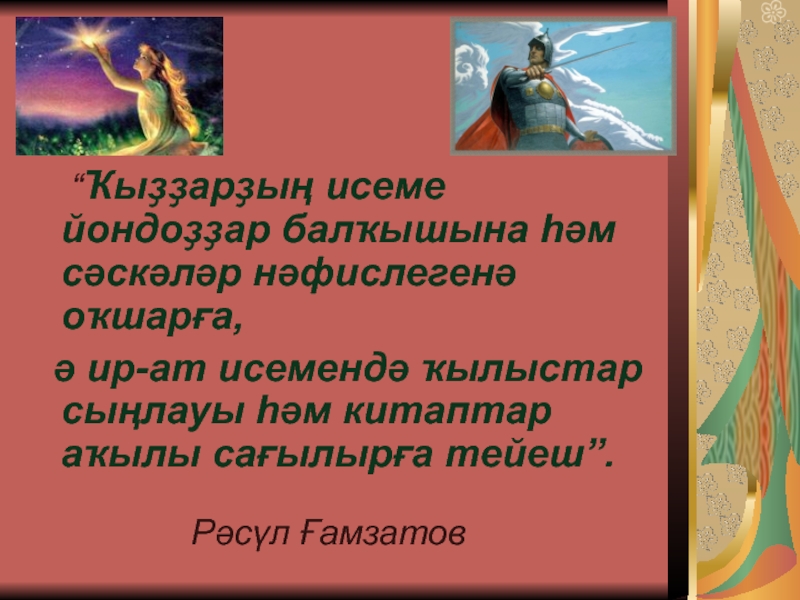 исемендә ҡылыстар сыңлауы һәм китаптар аҡылы сағылырға тейеш”. Рәсүл Ғамзатов