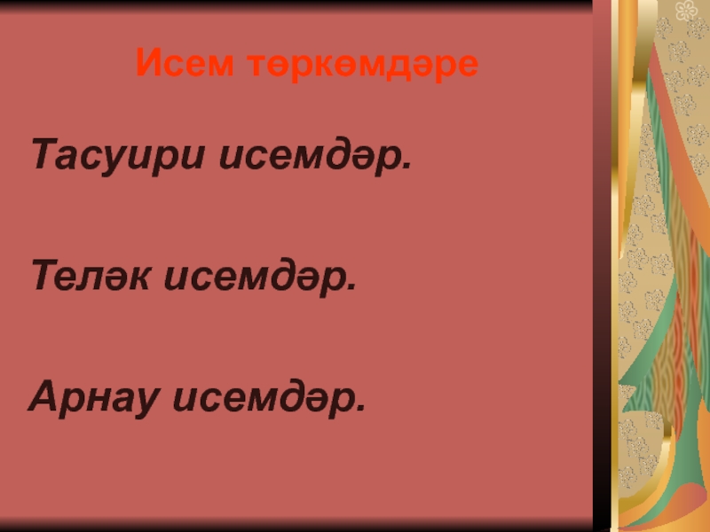 Исем төркөмдәреТасуири исемдәр.Теләк исемдәр.Арнау исемдәр.