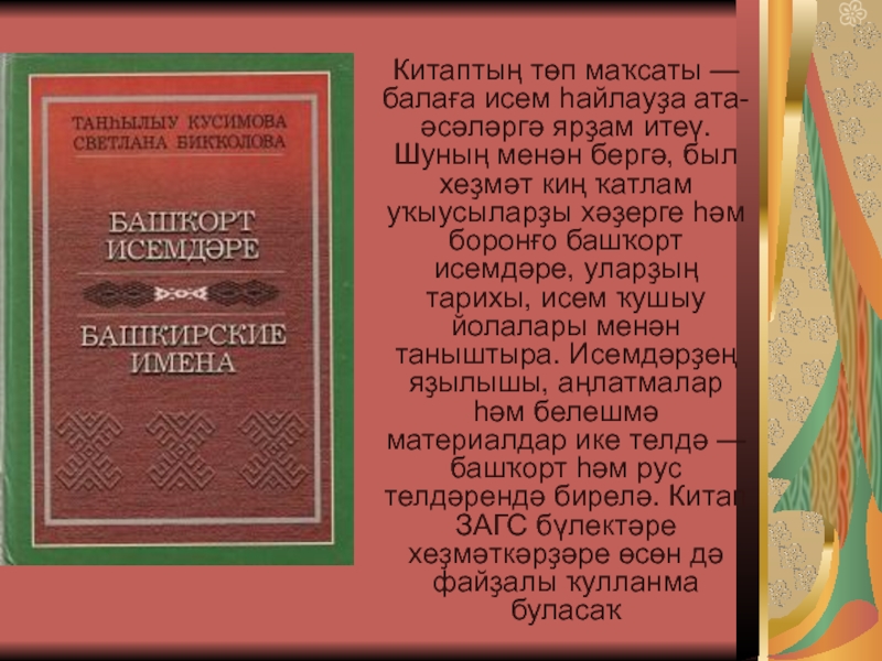 Китаптың төп маҡсаты — балаға исем һайлауҙа ата-әсәләргә ярҙам итеү. Шуның