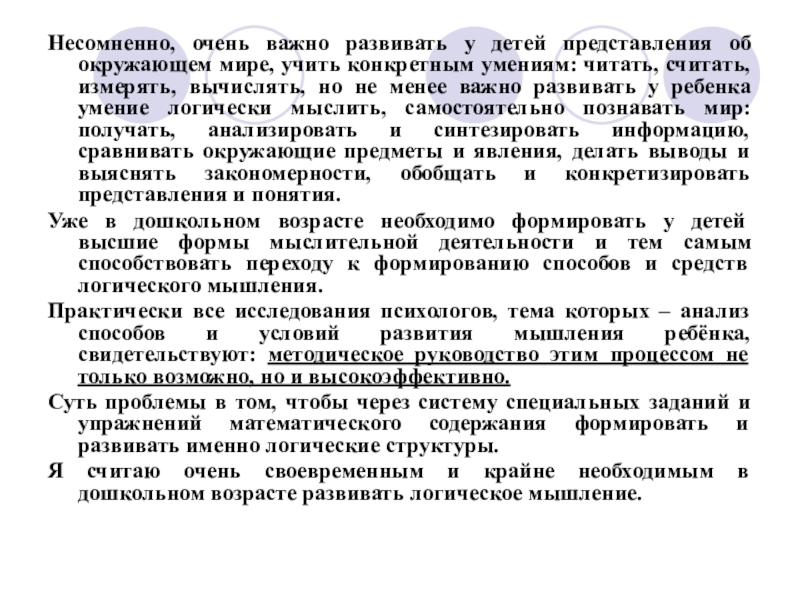 Уже в дошкольном возрасте необходимо формировать у детей высшие формы мыслительной деятельности и тем самым способствовать переходу к формированию способов и средств логического мышления.