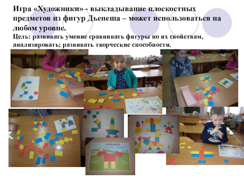 Слайд 17Игра «Художники» - выкладывание плоскостных предметов из фигур Дьенеша – может