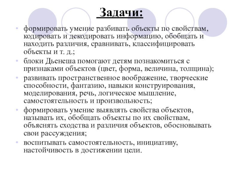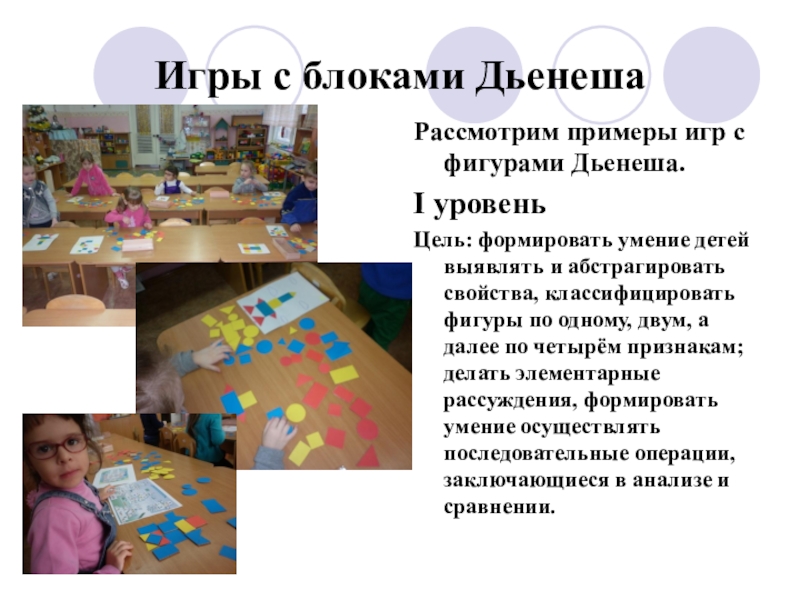 умение детей выявлять и абстрагировать свойства, классифицировать фигуры по одному, двум, а далее по четырём признакам; делать элементарные рассуждения, формировать умение осуществлять последовательные операции, заключающиеся в анализе и сравнении.