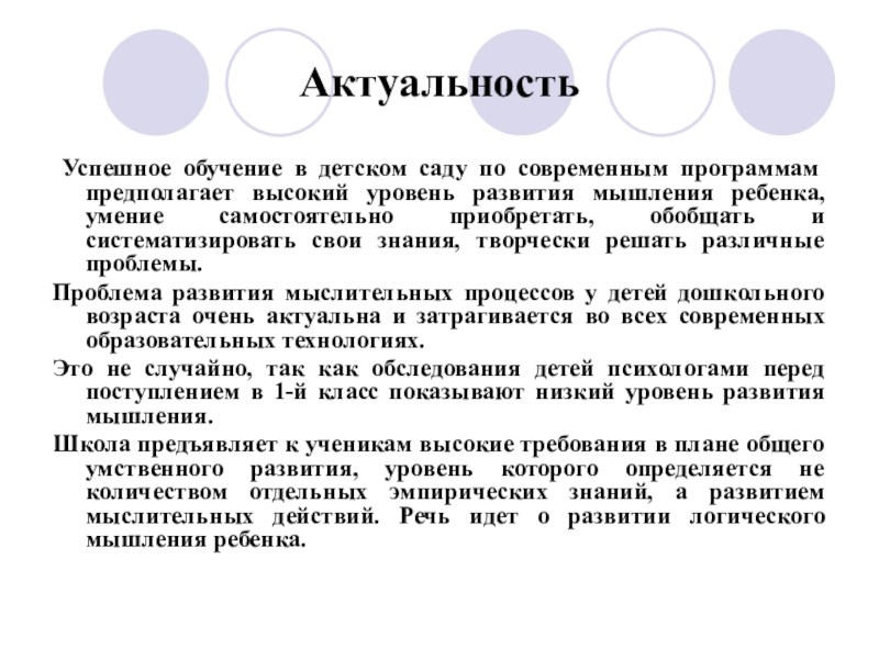 Проблема развития мыслительных процессов у детей дошкольного возраста очень актуальна и затрагивается во всех современных образовательных технологиях.
