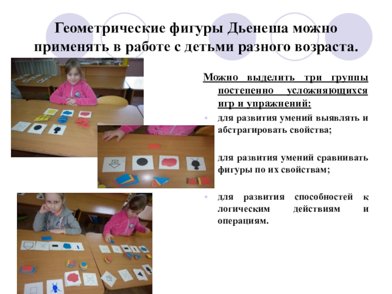 Слайд 11Геометрические фигуры Дьенеша можно применять в работе с детьми разного возраста.