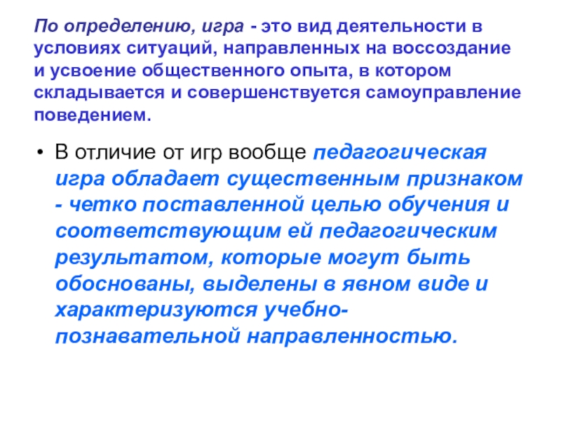 В отличие от игр вообще педагогическая игра обладает существенным признаком - четко поставленной целью обучения и соответствующим ей педагогическим результатом, которые могут быть обоснованы, выделены в явном виде и характеризуются учебно-познавательной направленностью.