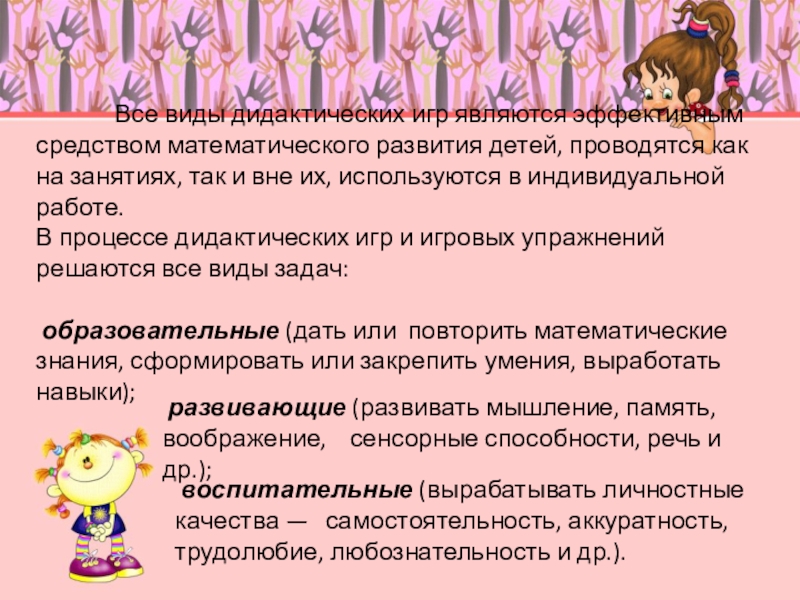 развивающие (развивать мышление, память, воображение, сенсорные способности, речь и др.);