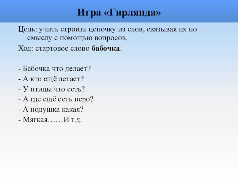 Цель: учить строить цепочку из слов, связывая их по смыслу с