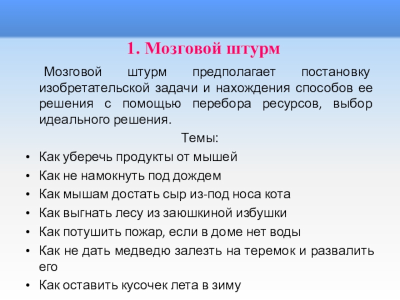 Слайд 8 Мозговой штурм предполагает постановку изобретательской задачи и нахождения способов ее решения