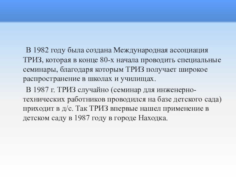 в конце 80-х начала проводить специальные семинары, благодаря которым ТРИЗ получает широкое распространение в школах и училищах.
