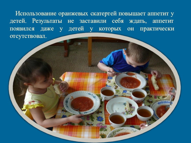 Слайд 5 Использование оранжевых скатертей повышает аппетит у детей. Результаты не
