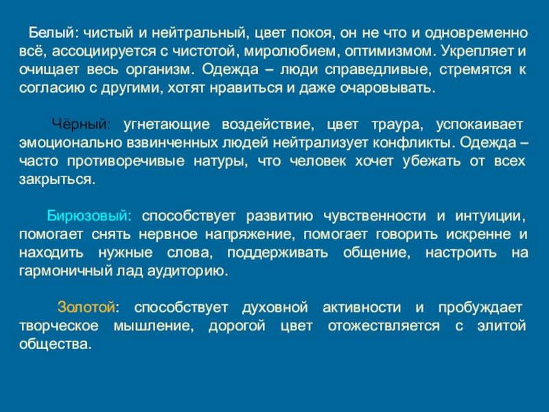 Синий: нейтральный цвет, рассеивает внимание, снижает работоспособность. Одежда – независимы и умны, чувство ответственности.