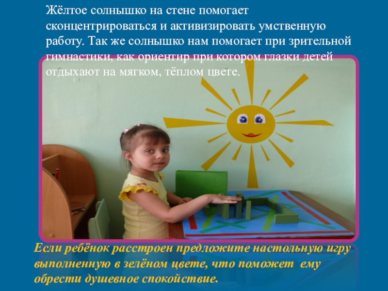 Слайд 10Жёлтое солнышко на стене помогает сконцентрироваться и активизировать умственную работу. Так