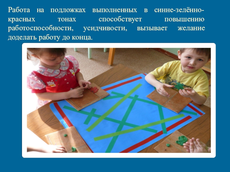 Слайд 6Работа на подложках выполненных в синне-зелённо-красных тонах способствует повышению работоспособности, усидчивости,
