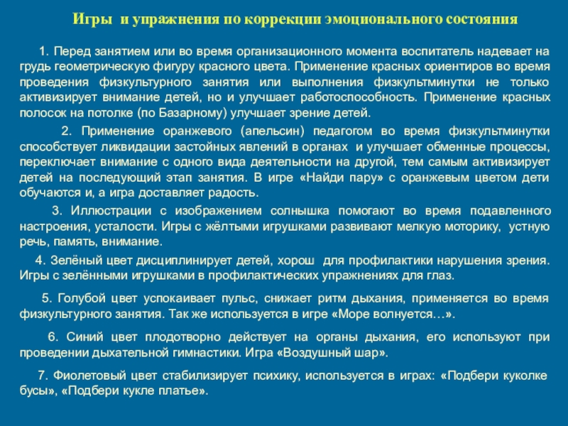6. Синий цвет плодотворно действует на органы дыхания, его используют при проведении дыхательной гимнастики. Игра «Воздушный шар».