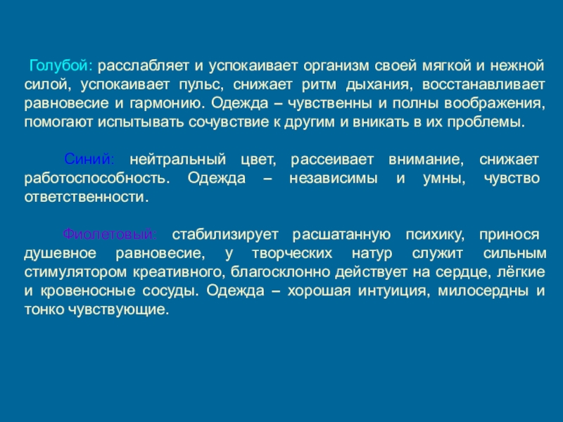 силой, успокаивает пульс, снижает ритм дыхания, восстанавливает равновесие и гармонию. Одежда – чувственны и полны воображения, помогают испытывать сочувствие к другим и вникать в их проблемы.