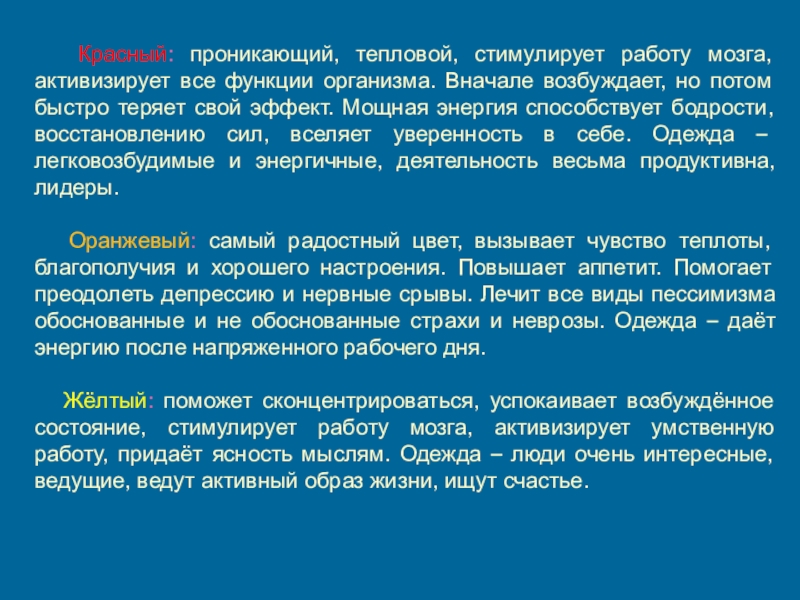 Слайд 13 Красный: проникающий, тепловой, стимулирует работу мозга, активизирует все функции