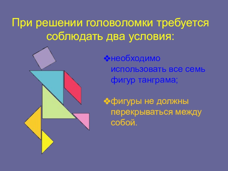 Слайд 11При решении головоломки требуется соблюдать два условия: